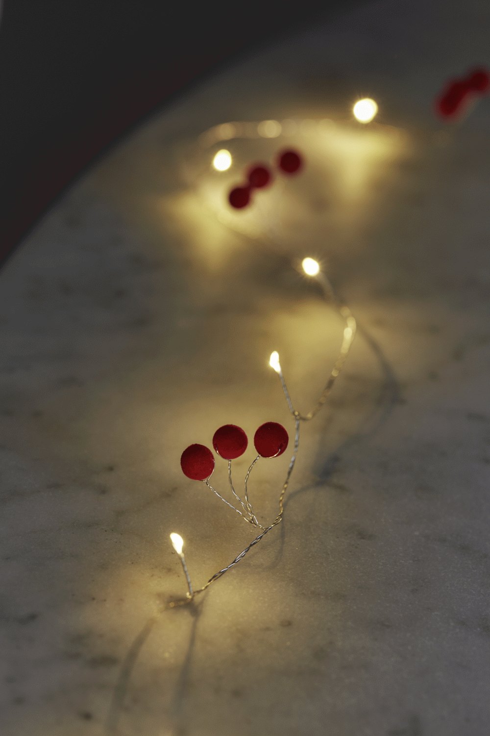 Die kleinen roten Kugeln verleihen der Lichterkette einen festlichen und stilvollen Ausdruck, der sowohl für gemütliche Alltagsmomente als auch für besondere Anlässe und saisonale Dekoration ideal geeignet ist. Hergestellt aus hochwertigem Metall, liefert sie ein sanftes, warmes Licht, das eine einladende Atmosphäre in deinem Zuhause schafft.