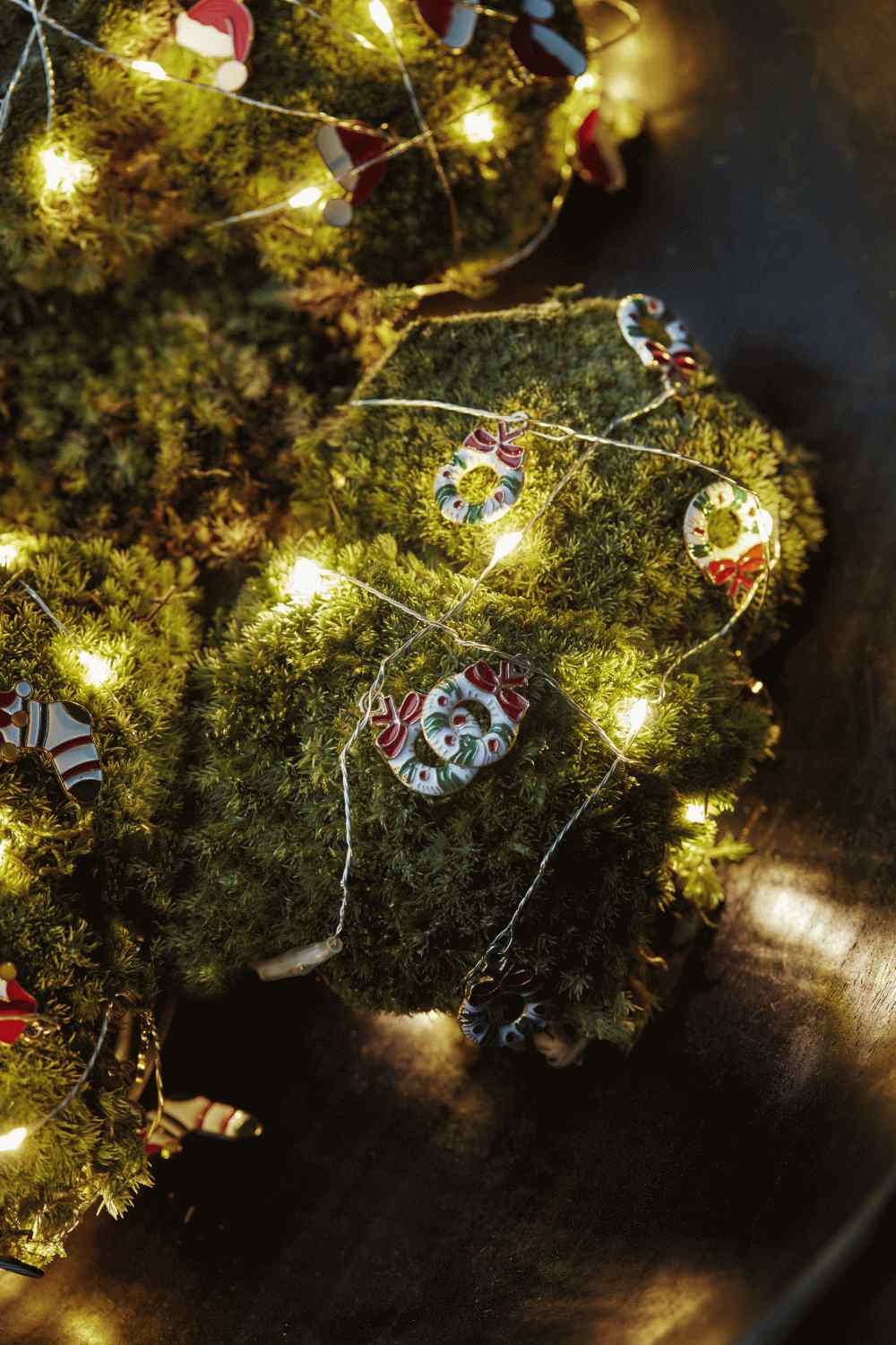 Das Herzstück dieser besonderen Lichterkette bilden 10 warmweiße LED-Lichter, die geschickt mit 9 kleinen dekorativen Kränzen kombiniert sind. Jeder Kranz ist mit roten und grünen Bändern geschmückt und verleiht der Dekoration eine traditionelle, handwerkliche Note. Diese liebevollen Details machen jede Lichterkette zu einem Unikat und spiegeln die skandinavische Tradition wider, Weihnachtsschmuck mit persönlicher Note zu gestalten.