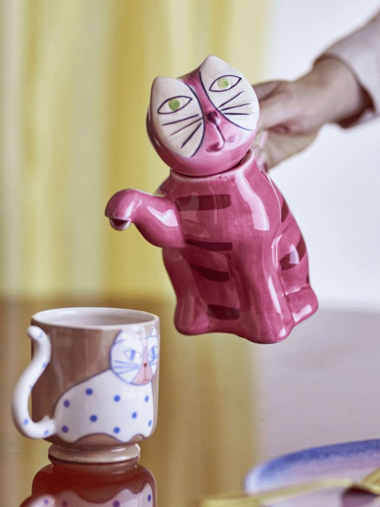 Mit dieser bezaubernden Teekanne in Form einer sitzenden Katze holst du dir ein Stück skandinavische Designfreude direkt in deine Küche. Die Missy Teekanne von Bloomingville vereint praktische Funktionalität mit einem verspielten, charaktervollen Auftritt, der deinen Teetisch garantiert zum Gesprächsthema macht. Gefertigt aus robustem Steinzeug, bietet dir diese Kanne nicht nur eine hervorragende Wärmespeicherung für deinen Lieblingstee, sondern auch eine Langlebigkeit, die den täglichen Gebrauch mühelos meistert.Das durchdachte Design zeigt sich in jedem Detail: Der geschwungene Schwanz der Katze dient als ergonomischer Henkel, der dir ein angenehmes und sicheres Eingießen ermöglicht. Die handbemalte Oberfläche in warmem Rosa mit roten Streifen verleiht der Teekanne einen lebendigen und einladenden Charakter, während die grünen Augen und sorgfältig ausgearbeiteten Gesichtszüge eine fröhliche, spielerische Note hinzufügen. Da jede Kanne von Hand bemalt wird, entstehen natürliche Variationen in Muster und Farbintensität – so wird jedes Exemplar zu einem Unikat mit authentischem handwerklichem Charme.