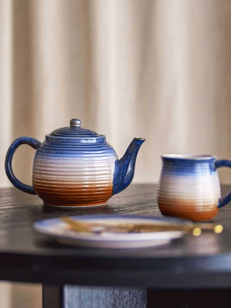 Die charakteristische geriffelte Struktur verleiht der Kanne einen angenehmen und harmonischen Ausdruck, während die glasierte Oberfläche ein wunderschönes Farbspiel in Nuancen von tiefem Blau, Rosa und Rostrot erzeugt. Diese Kombination der Farben gibt der Teekanne einen persönlichen Charakter, der sowohl zu modernen als auch zu klassischen Einrichtungsstilen passt. Mit einem Fassungsvermögen von 89 cl ist die Kanne ideal, um Tee für mehrere Personen zu servieren, was sie sowohl für den täglichen Gebrauch als auch für Gäste perfekt macht.