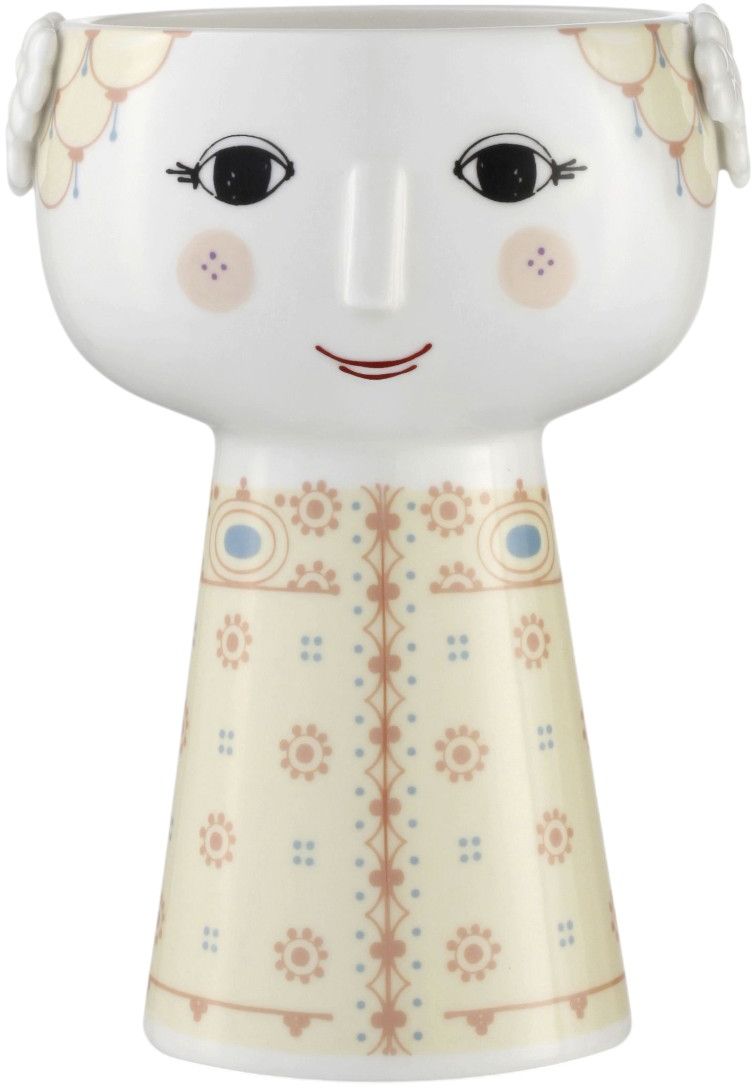 Das schlanke Silhouett und die kompakte Größe machen diese Vase ideal für kleinere Blumenarrangements oder einzelne Blüten. Die glänzend glasierte Porzellanoberfläche hebt das elegante Blütenmuster im Relief hervor, das beide Seiten der Vase schmückt. Das rosafarbene Dekor verleiht einen femininen Touch, während das charakteristische Gesicht auf der Vase direkt aus Wiinblads ursprünglichem Strich der allerersten EVA-Vasen stammt – ein authentisches Stück dänischer Designgeschichte.