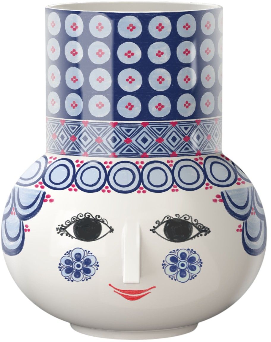 Die zylindrische Form wird von Olgas liebenswertem Gesicht mit den charakteristischen mandelförmigen Augen und der dreieckigen Nase geschmückt – Markenzeichen von Wiinblads künstlerischer Handschrift. Die dunkelblaue Basis wird wunderschön durch kontrastierende rubinrote Punkte akzentuiert, die ein dynamisches visuelles Erlebnis schaffen. Gefertigt aus glasierter Keramik mit sorgfältig aufgebrachten farbenfrohen Decals, vereint die Olga Vase originale Wiinblad-Muster in einer frischen, modernen Farbpalette, die jedem Raum Charakter und Wärme verleiht.