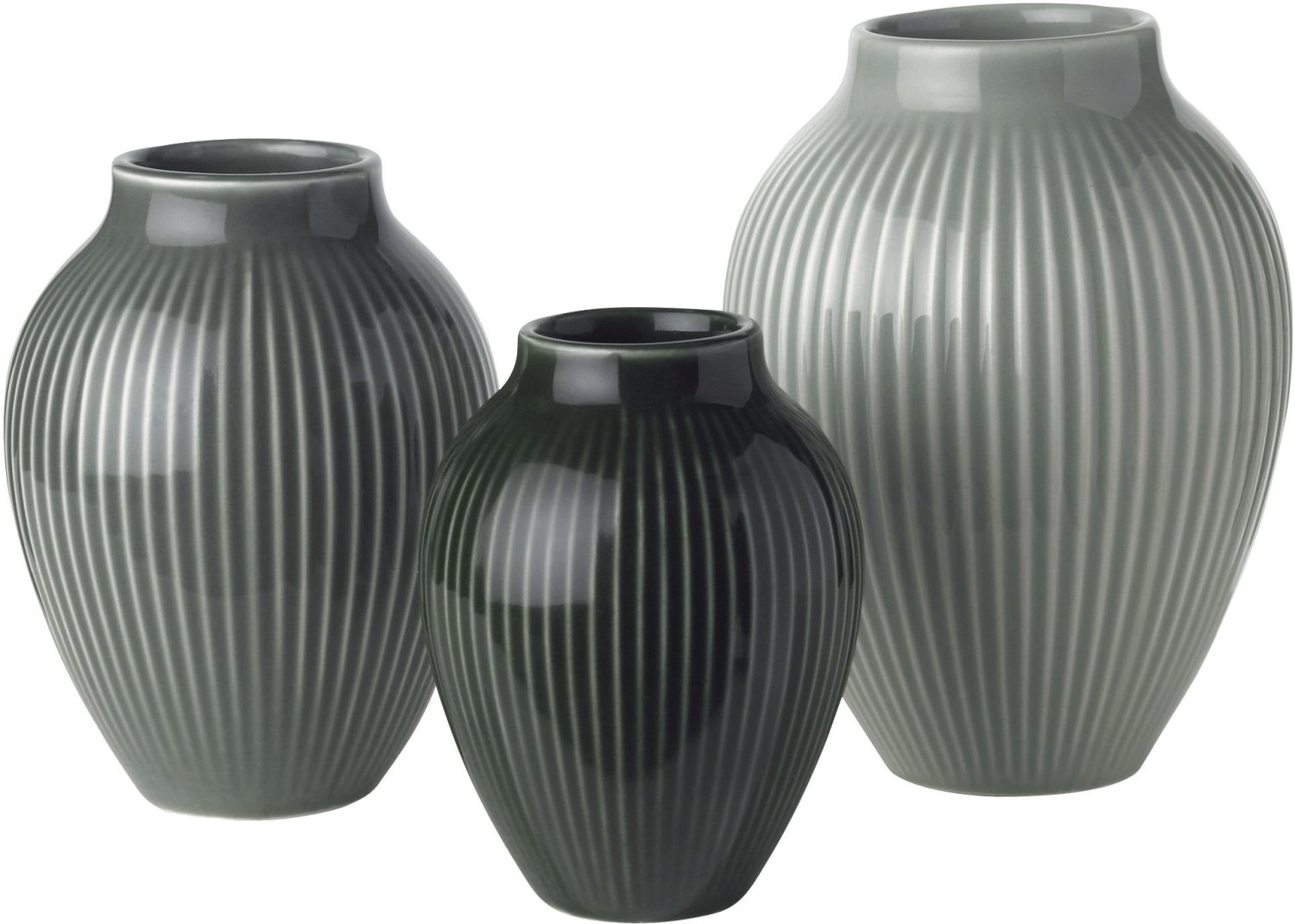 Diese wunderschöne Ripple Vase von Knabstrup Keramik vereint klassische dänische Handwerkstradition mit modernem Design in einem 3er-Set, das die Nuancen der Natur in dein Zuhause bringt. Mit ihren Wurzeln aus den späten 1940er Jahren repräsentiert diese Vase Generationen keramischer Expertise und zeitlose Formgebung, die heute noch genauso relevant ist wie damals.Die charakteristische gerillte Oberfläche der Vasen haucht der klassischen Silhouette neues Leben ein und schafft ein faszinierendes Spiel zwischen Licht und Schatten. Die drei grünen Nuancen - Mat Misty Green, Celadon Green und Dark Green - wurden sorgfältig ausgewählt, um sich perfekt zu ergänzen und Harmonie in jeder Wohneinrichtung zu schaffen. Die Farbpalette reicht vom sanften, pudrigen Misty Green über das elegante Celadon bis hin zum tiefen, satten Dunkelgrün.