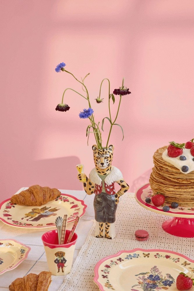 Mit dieser außergewöhnlichen Keramikvase bringst du künstlerischen Charme und spielerische Eleganz in dein Zuhause – ein faszinierendes Ergebnis der Zusammenarbeit zwischen der dänischen Marke RICE und der französischen Künstlerin Nathalie Lété. Diese einzigartige Vase ist als charmanter Leopard geformt, der einen Cocktail genießt, und wird sofort zum Gesprächsthema und zaubert ein Lächeln auf die Gesichter, egal wo du sie platzierst.Die charakteristische Leoparden-Silhouette mit dem Cocktailglas in der Hand verleiht deiner Einrichtung ein magisches und humorvolles Element, während sie gleichzeitig perfekt als Blumenvase funktioniert. Mit ihren kompakten Abmessungen von 15 cm Länge, 9 cm Breite und 26,5 cm Höhe passt sie ideal sowohl in kleine als auch große Räume.