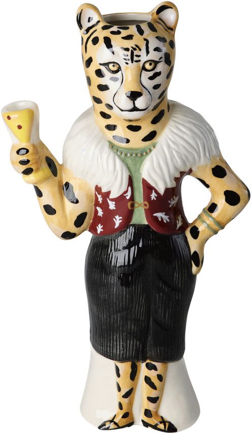 Die charakteristische Leoparden-Silhouette mit dem Cocktailglas in der Hand verleiht deiner Einrichtung ein magisches und humorvolles Element, während sie gleichzeitig perfekt als Blumenvase funktioniert. Mit ihren kompakten Abmessungen von 15 cm Länge, 9 cm Breite und 26,5 cm Höhe passt sie ideal sowohl in kleine als auch große Räume.