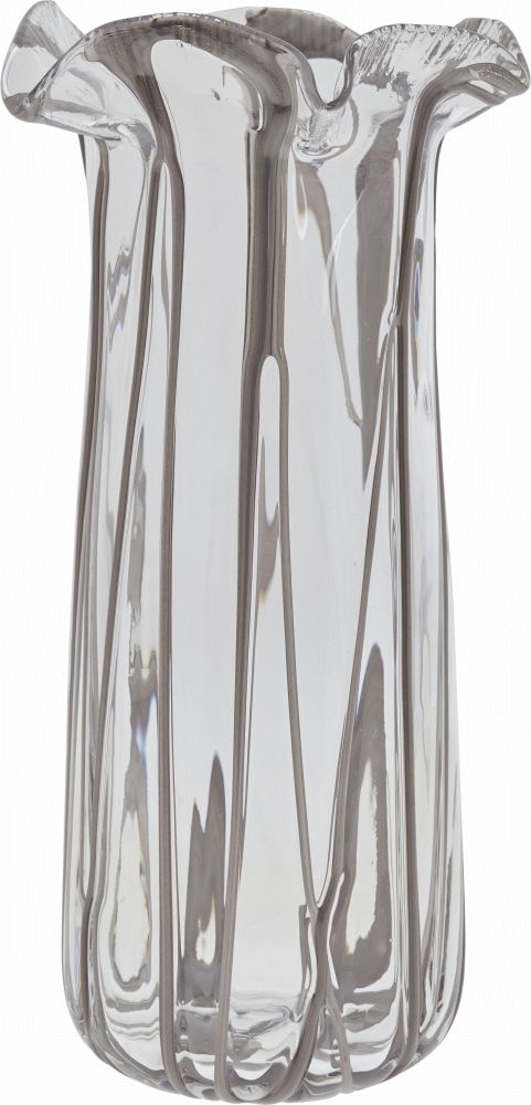 Das klare Glas mit seinen subtilen linearen Texturen fängt und reflektiert das Licht auf bezaubernde Weise und schafft dadurch ein faszinierendes Spiel aus Licht und Schatten. Die hohe, schlanke Form macht die Vase zu einem echten Blickfang, während ihre transparente Beschaffenheit dafür sorgt, dass sie niemals schwer oder dominant wirkt, obwohl sie durchaus Präsenz im Raum zeigt.