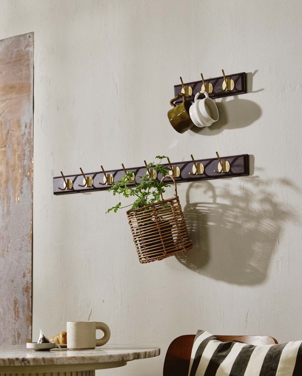 Das durchdachte Design der Edgy-Serie betont den reizvollen Kontrast zwischen der warmen Holzoptik und den markanten Eisenhaken, die ein grafisches und modernes Statement an deiner Wand setzen. Die goldenen Details im Design verleihen eine elegante Note, die das schlichte Konzept zu etwas Besonderem macht. Mit dieser Hakenleiste hat Nordal ein Produkt geschaffen, das sowohl als praktische Aufbewahrungslösung als auch als dekoratives Element funktioniert.