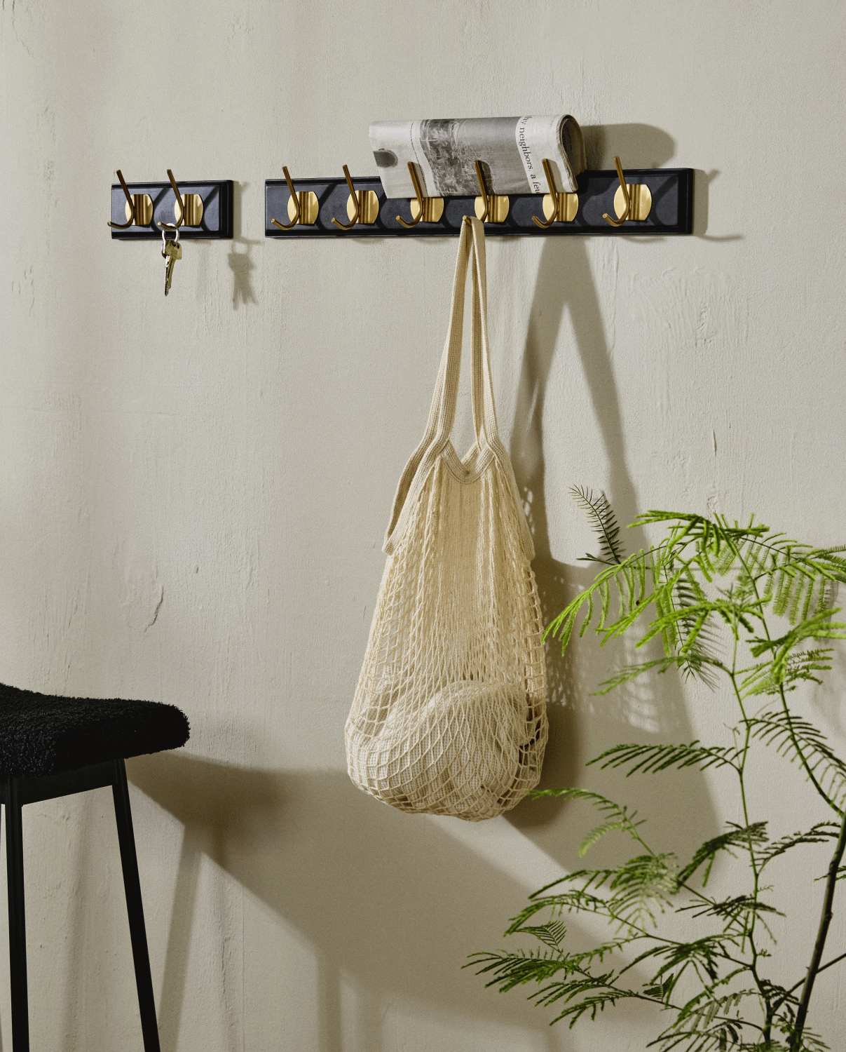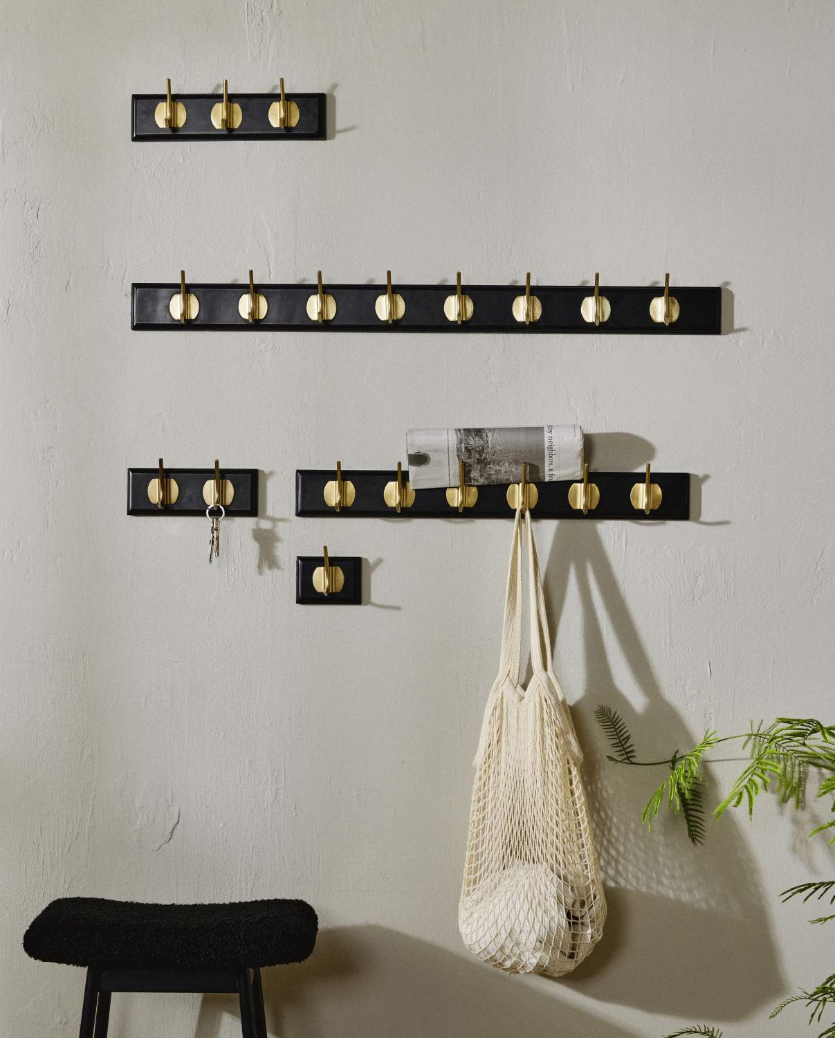 Nordal beweist mit diesem Produkt, dass auch die kleinsten Details großen Einfluss auf die Gesamtwirkung eines Raumes haben können. Die stilreine Kontrastwirkung zwischen dem dunklen MDF-Material und den warmen goldenen Eisenhaken schafft ein grafisches Element, das gleichzeitig als praktische Aufbewahrungslösung und dekoratives Wandelement funktioniert.