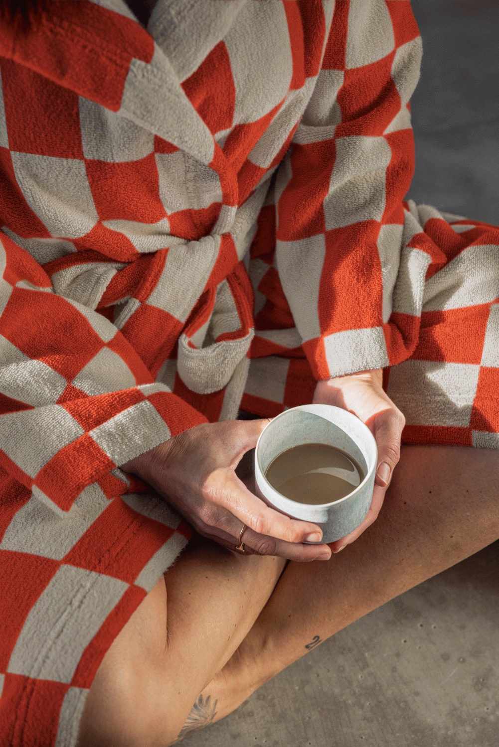 Dieser weiche Bademantel aus der Retro-Kollektion von Mette Ditmer vereint Gemütlichkeit mit einem auffälligen geometrischen Design, das deinem Badezimmer einen modernen Akzent verleiht. Die charakteristische Frottee-Struktur aus hochwertiger Baumwolle sorgt für optimale Saugfähigkeit und ein angenehmes Tragegefühl auf der Haut, während das markante Muster in Sand und Weinrot einen stilvollen Kontrast zur warmen, orangefarbenen Grundfarbe bildet. Das durchdachte Design spiegelt Mette Ditmers Fokus auf Funktionalität und Ästhetik wider und bringt skandinavische Designtradition mit zeitgemäßem Ausdruck in dein Zuhause.Das hellblaue Kontrastband auf der Innenseite fügt eine überraschende Farbdetail hinzu, das zusammen mit dem passenden Logo-Label an der Tasche die handwerkliche Qualität unterstreicht. Der Unisex-Schnitt mit entspannter Passform macht den Bademantel für alle geeignet, während der bindbare Taillengürtel eine individuelle Anpassung ermöglicht. Die praktischen Seitentaschen bieten Platz für kleine Notwendigkeiten, und die leichte Konstruktion macht ihn ideal für den täglichen Gebrauch – ob nach dem Bad, einem Schwimmbad-Besuch oder für entspannte Morgenstunden zu Hause.