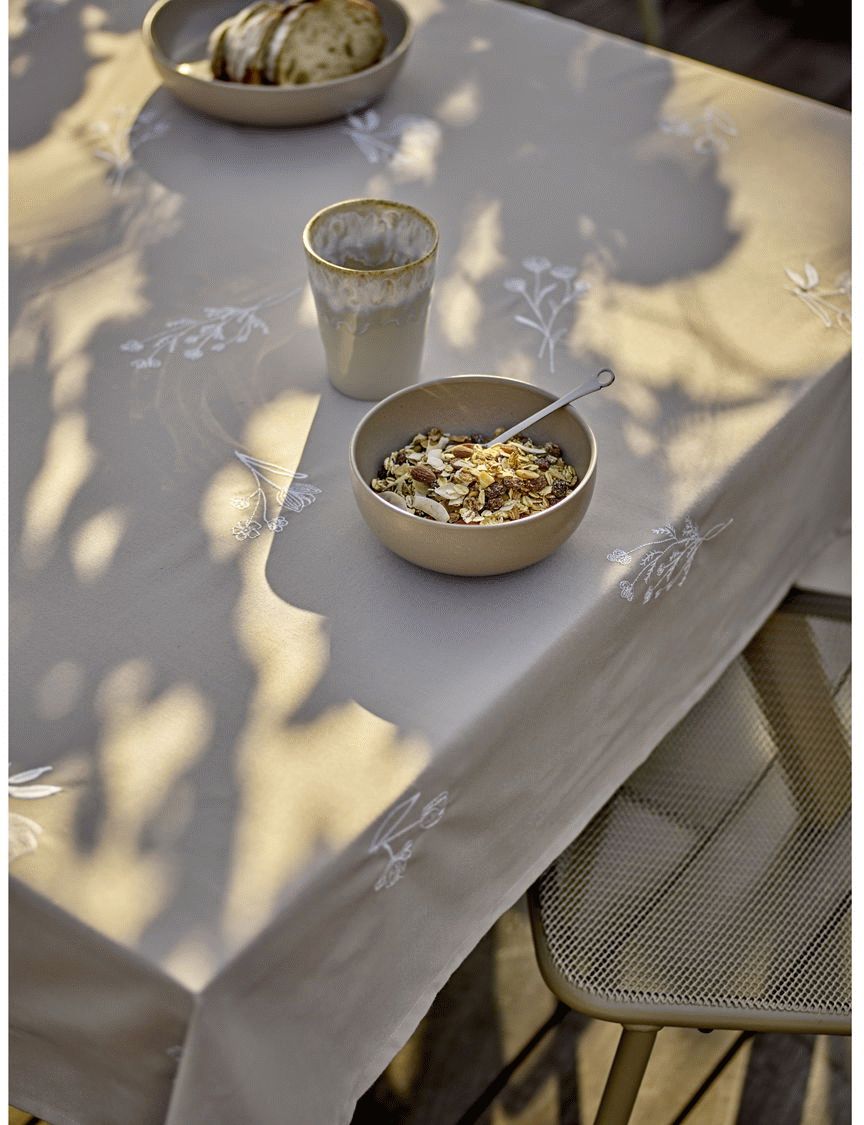 Mit ihren großzügigen Maßen von 140x220 cm passt die Decke perfekt zu mittelgroßen und größeren Tischen, wo sie eine harmonische und zusammenhängende Tischgestaltung ermöglicht. Die natürliche Farbwahl macht es dir leicht, die Tischdecke mit verschiedenem Geschirr, Gläsern und Besteck zu kombinieren, während die weißen Stickereien einen eleganten Touch hinzufügen.