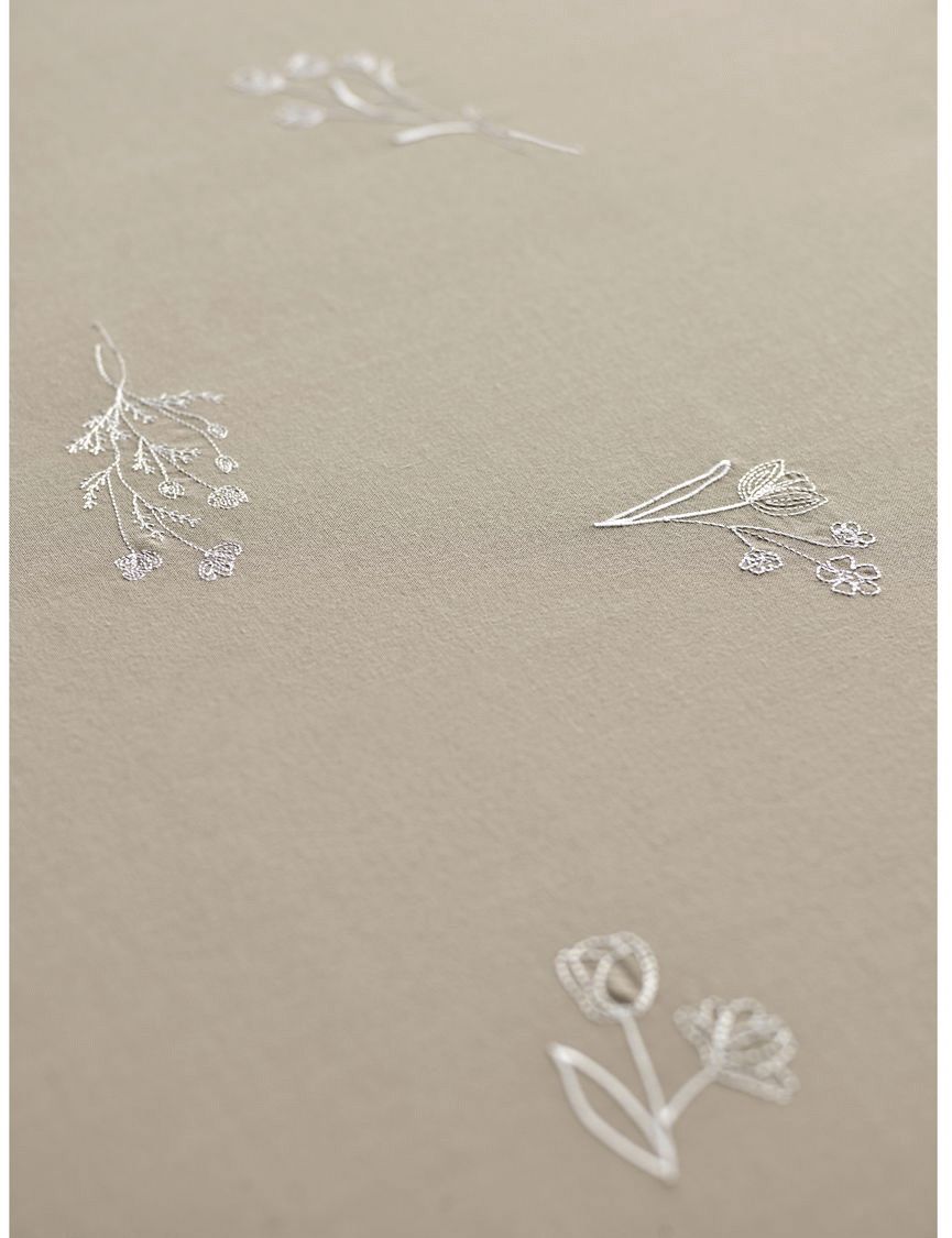 • Elegante Tischdecke mit feinen, weiß bestickten Blumen auf naturfarbenem Grund