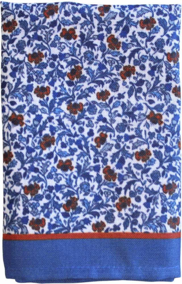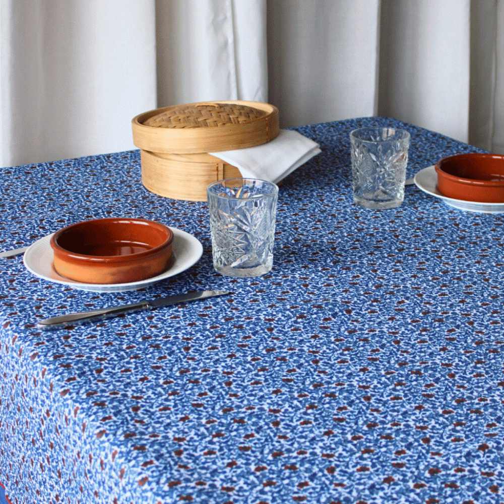 Die blaue Grundfarbe schafft eine harmonische Basis, während warme braune Nuancen elegant hervortreten und der Tischdecke ihren charakteristischen und sophistizierten Ausdruck verleihen. Dieses durchdachte Design wird von einer dekorativen Bordüre umrahmt, die das Muster perfekt abschließt und dem Gesamtbild den letzten Schliff verleiht.