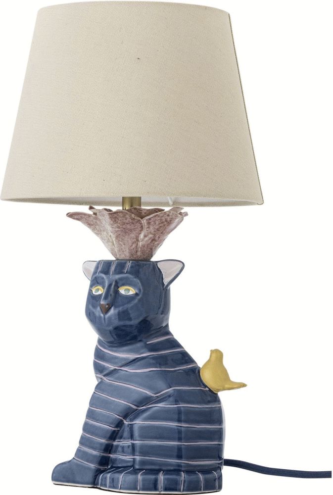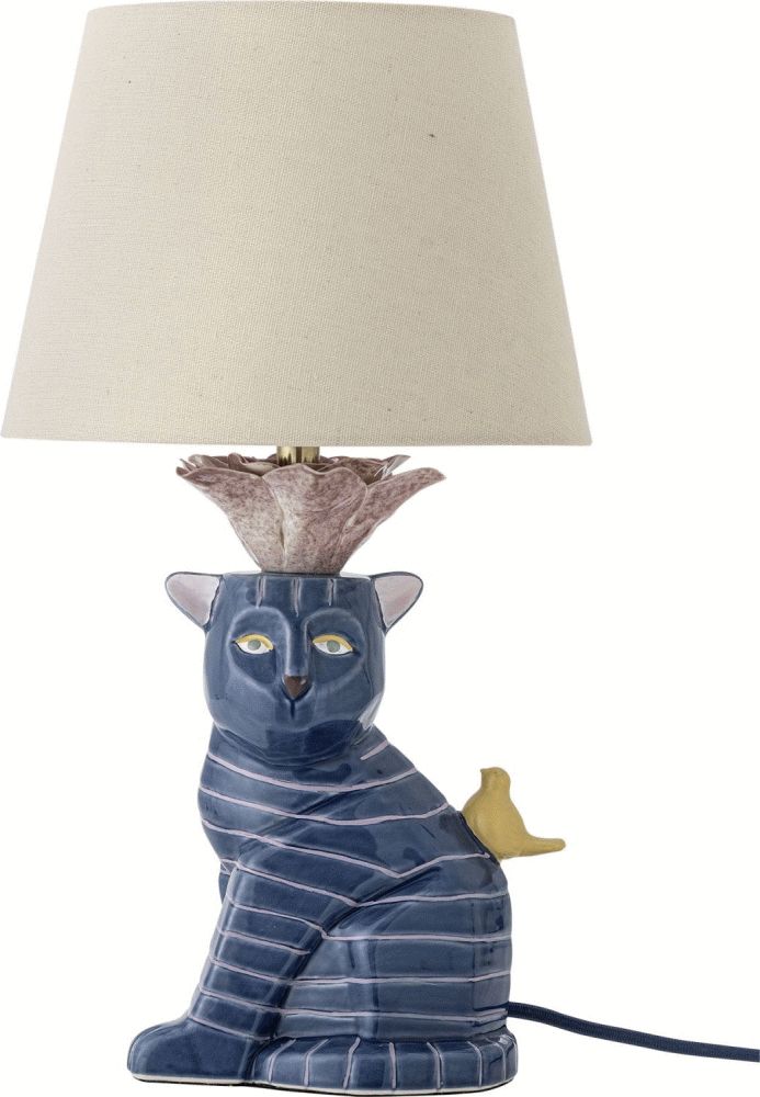 Der Lampenfuß aus hochwertigem Steingut zeigt eine Katze mit ausdrucksstarken Augen, die dem Design Leben und Persönlichkeit verleihen. Die rosa Streifen verlaufen elegant über den Körper und schaffen zusammen mit dem kleinen gelben Vogel, der neben der Katze sitzt, ein verspieltes und fantasievolles Gesamtbild. Jedes Detail wurde sorgfältig ausgearbeitet, um Funktionalität und dekorative Schönheit perfekt zu vereinen. Die beige Lampenschirm aus Leinen erzeugt ein angenehmes, warmes Licht – ideal zum Lesen oder für gemütliche Stunden. Zwischen Fuß und Schirm befindet sich eine rosenförmige Verzierung, die der Leuchte einen raffinierten und durchdachten Ausdruck verleiht.