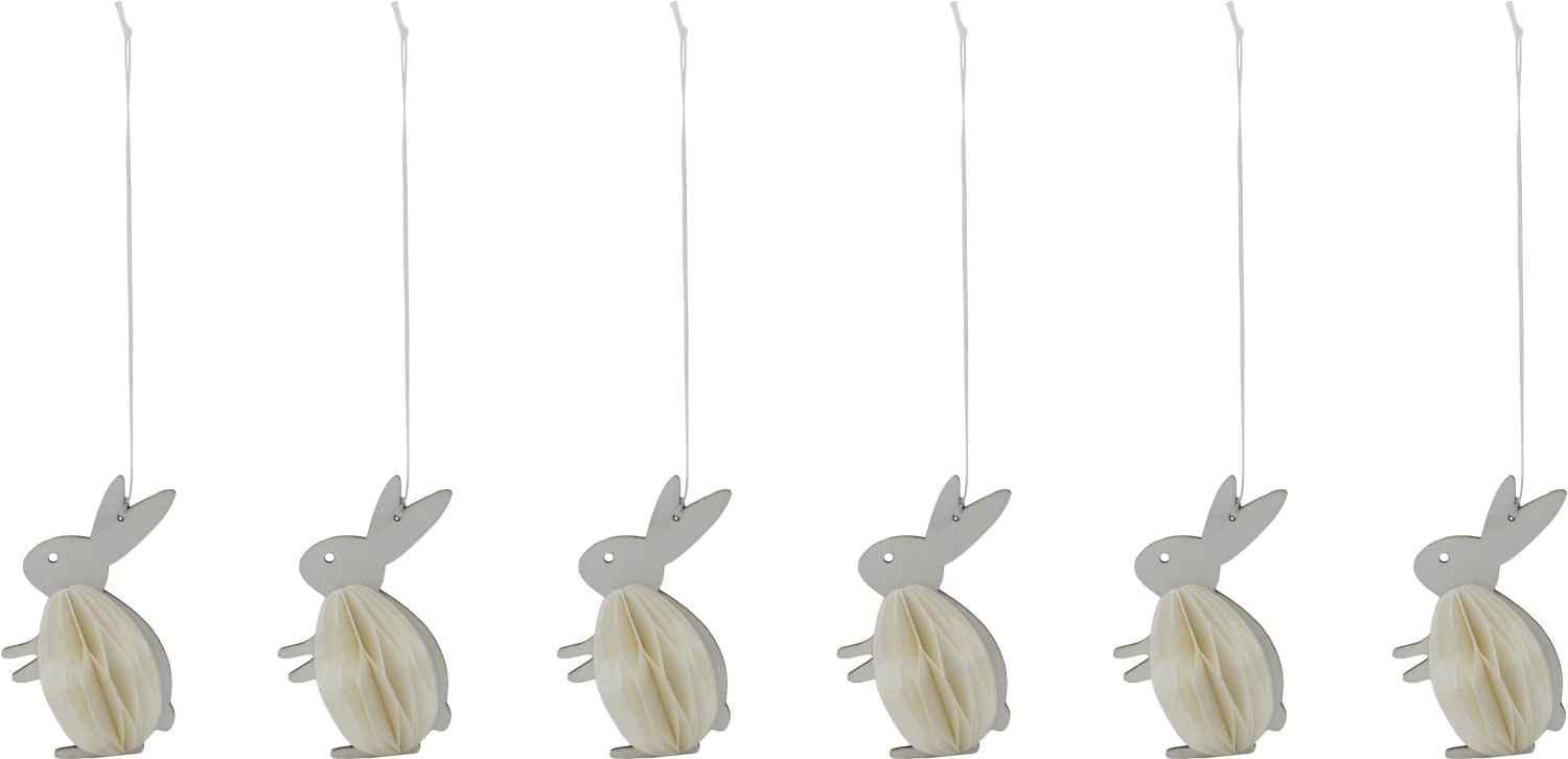 Mit diesem bezaubernden 6er-Set aus cremefarbenen Hasenfiguren holst du dir eine leichte und luftige Frühlingsatmosphäre direkt in dein Zuhause. Die dekorativen Figuren aus rohmilchweißem Papier bestechen durch ihre einzigartige Honeycomb-Struktur, die ihnen einen dreidimensionalen und lebendigen Charakter verleiht. Das schlichte und zugleich elegante Design macht sie zum perfekten Detail deiner Osterdekoration und fügt sich harmonisch in jeden Wohnraum ein.Jede Hasenfigur lässt sich mühelos auffalten und mit der mitgelieferten Schlaufe genau dort aufhängen, wo du es möchtest. Ob im Fenster, an Zweigen in einer Vase oder als Teil einer größeren Tischdekoration – dank des geringen Gewichts kannst du die Figuren vielseitig einsetzen, ohne dass sie die Aufhängung belasten. Das rohmilchweiße Farbschema passt wunderbar zur skandinavischen Einrichtung und lässt sich spielend mit anderen Farben und Materialien kombinieren, um deinem Zuhause eine persönliche Note zu verleihen.