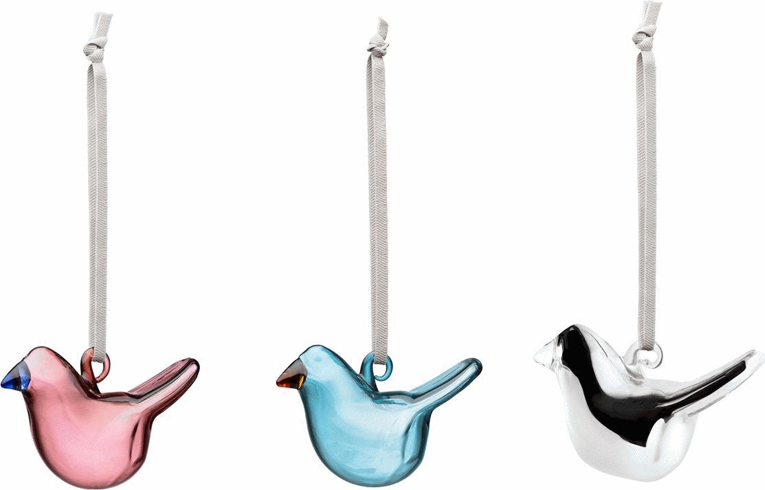 • Set mit drei mundgeblasenen Glasvögeln in Rot, Blau und Stahl