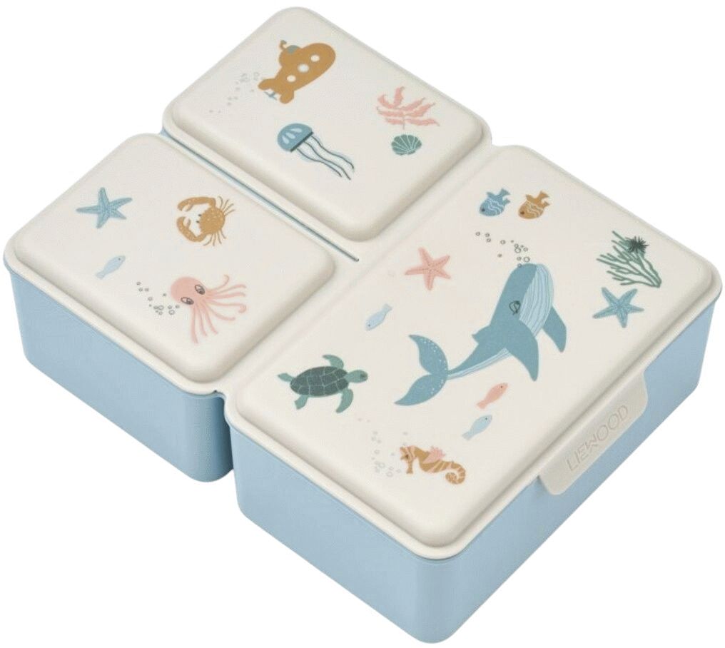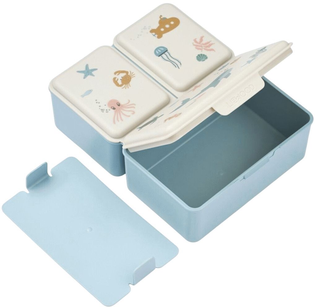 Das durchdachte Design mit drei individuellen Fächern bedeutet, dass du verschiedene Lebensmittel problemlos kombinieren kannst, ohne dir Sorgen über vermischende Aromen machen zu müssen. Jedes Fach lässt sich separat öffnen, wodurch es für Kinder kinderleicht wird, selbstständig an ihre gesunden Snacks zu gelangen. Das bezaubernde Sea Creature/Sandy Motiv mit Meerestieren in sandfarbenen Tönen verleiht den Mahlzeiten ein spielerisches Element und inspiriert die Kleinen dazu, ihr Essen mit Begeisterung zu genießen.