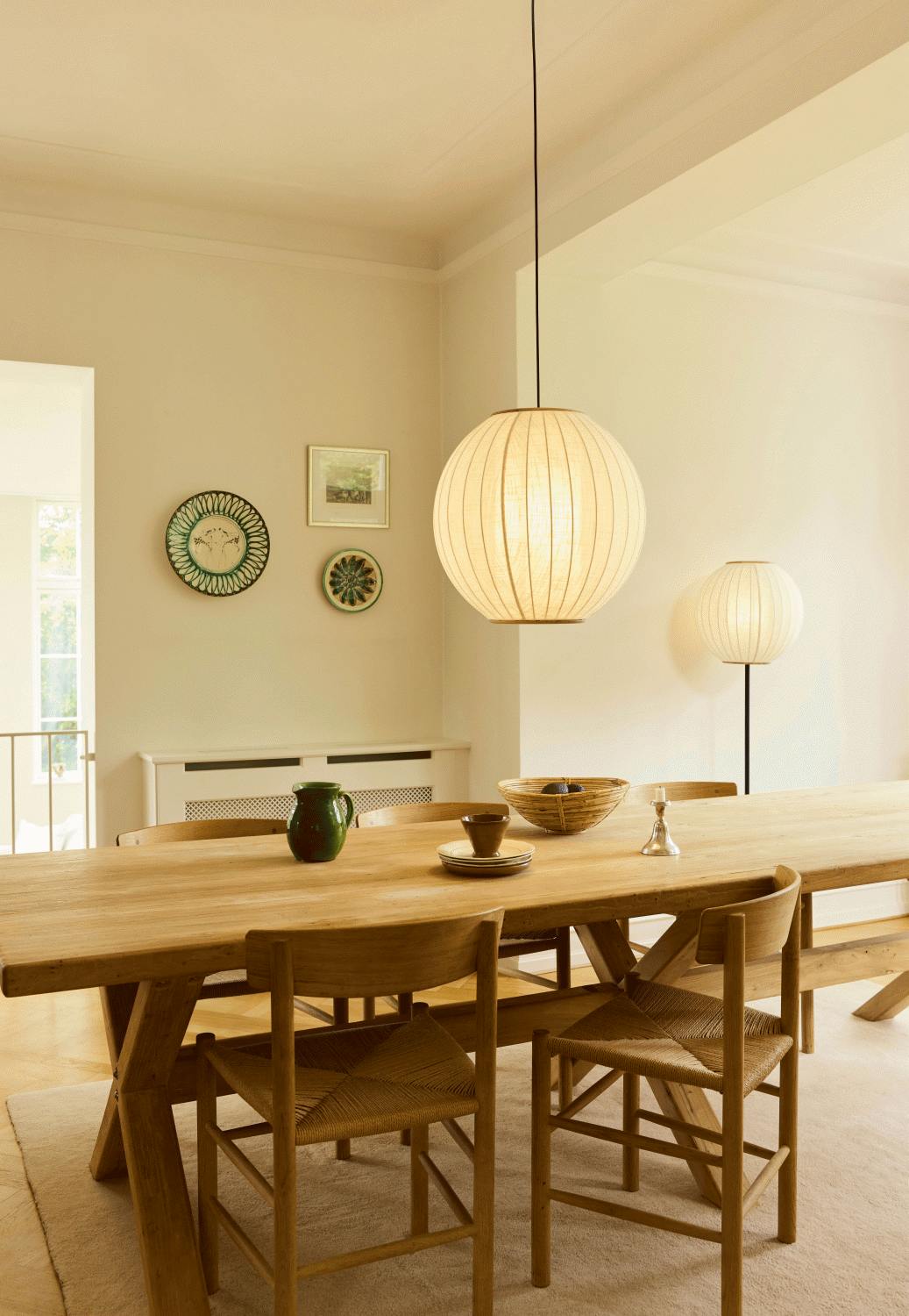 Die charakteristische Ballonform entsteht durch hochwertiges Textilmaterial, das für eine sanfte und angenehme Lichtverteilung im Raum sorgt. Besonders beeindruckend sind die Details aus massivem Holz am oberen und unteren Ende des Lampenschirms, die einen natürlichen und warmen Akzent setzen. Diese durchdachte Materialkombination schafft einen harmonischen Kontrast und verleiht der Leuchte ihren unverwechselbar skandinavischen Charakter, der sich mühelos in jeden Einrichtungsstil einfügt.