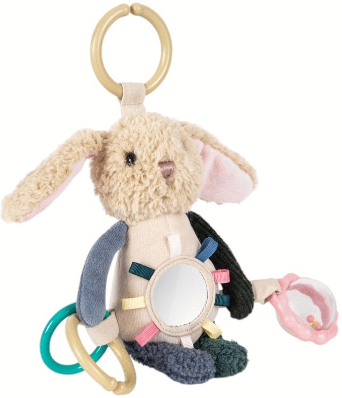Das weiche Polyester-Material macht das Peluche angenehm zu berühren, während die unterschiedlichen Oberflächentexturen taktile Erfahrungen bieten, die gezielt den Tastsinn entwickeln. Die integrierte Rasselfunktion erzeugt spannende Geräusche, die das Gehör stimulieren und deinem Baby wichtige Ursache-Wirkungs-Prinzipien vermitteln. Der kleine Spiegel fügt eine zusätzliche Spielebene hinzu und fördert sowohl die Selbstwahrnehmung als auch die visuelle Perzeption.