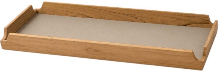 Die Ledereinlage in Nupo Clay Brown lässt sich herausnehmen und verleiht dem Tablett eine warme, erdige Nuance, die wunderbar mit der natürlichen Struktur des Teakholzes harmoniert. Die oberflächenbehandelte Ausführung sorgt dafür, dass das Tablett leicht zu pflegen ist – eventuelle Verschüttungen dringen nicht durch und hinterlassen keine Flecken auf dem Holz. Dieses schmale Tablett eignet sich hervorragend, um Snacks zu präsentieren, Getränke zu servieren oder als dekoratives Element auf dem Tisch oder einem Regal zu fungieren. Sein schlankes Format macht es besonders geeignet für lange Tische oder schmale Flächen, wo es sowohl als praktisches Servierwerkzeug als auch als stilvolle Dekoration dient.