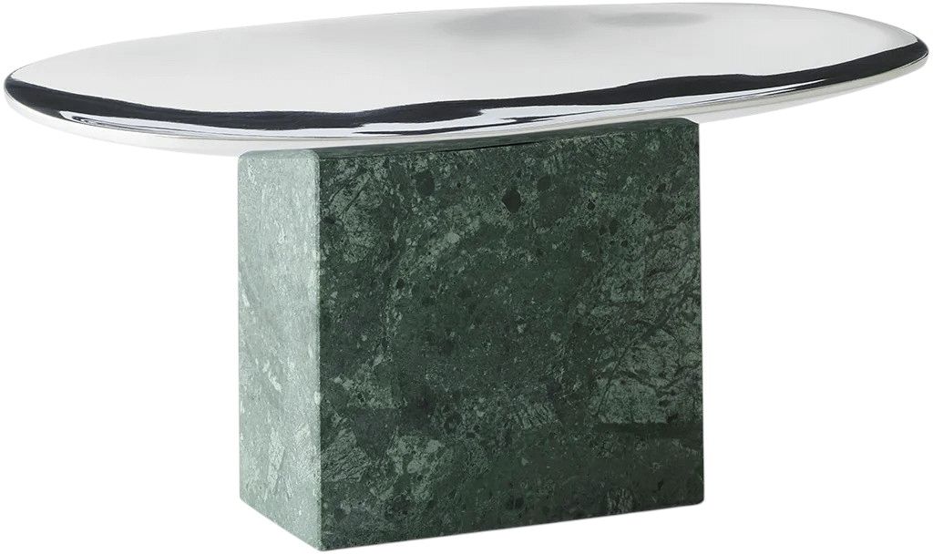 Der Name Sapoto, der auf Japanisch "mit Unterstützung" bedeutet, spiegelt die durchdachte Konstruktion dieses besonderen Tabletts wider. Das sandgegossene, handpolierte Aluminium harmoniert wunderschön mit der rohen, dunklen Marmorbase und schafft einen faszinierenden Kontrast zwischen verschiedenen Oberflächenstrukturen. Die glänzende, spiegelnde Aluminiumoberfläche steht in perfektem Gegensatz zur natürlichen, rauen Textur des Sandgusses und dem erdigen Charakter des Marmors.