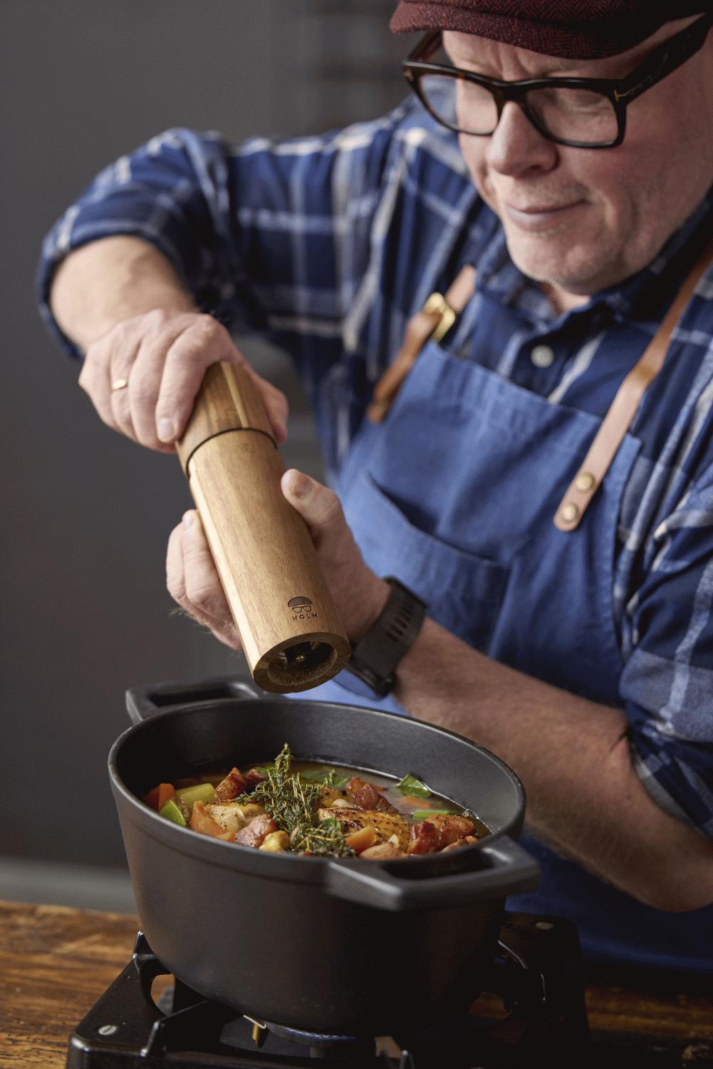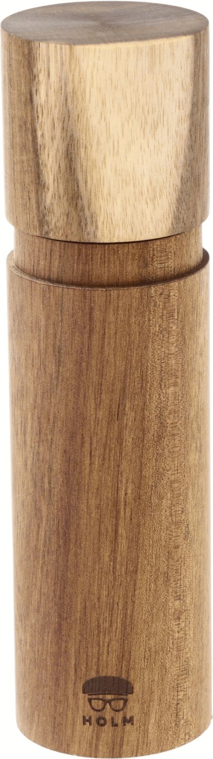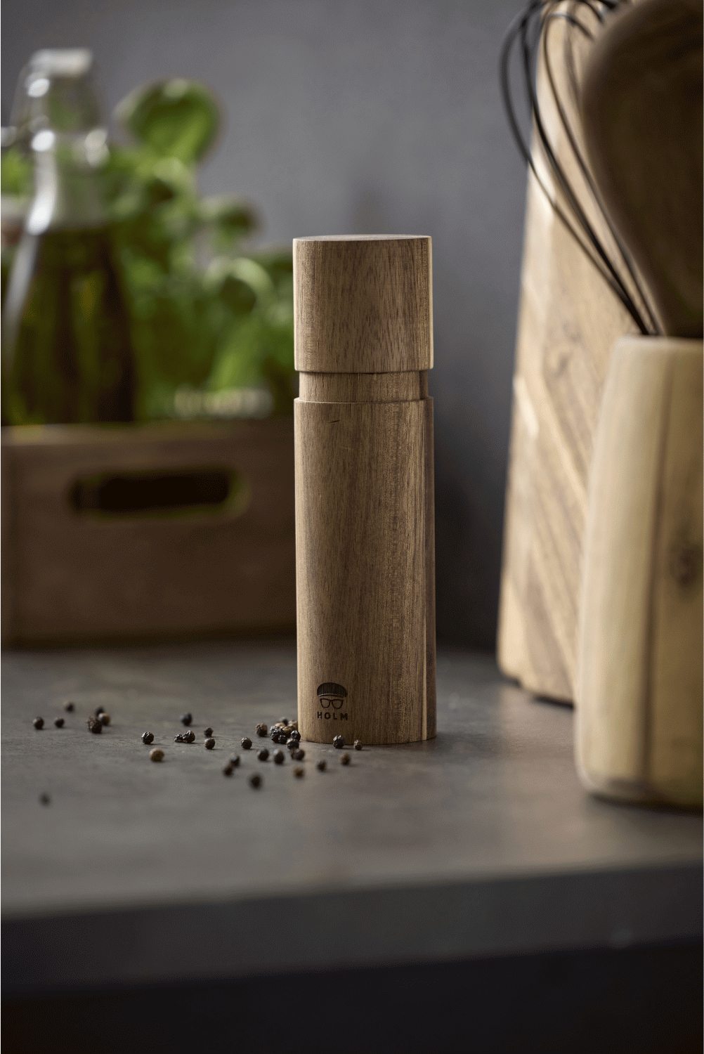 Diese HOLM Pfeffermühle aus Akazienholz verbindet Funktionalität mit zeitloser Ästhetik und bringt sowohl Charakter als auch Qualität in deine Küche. Mit ihrer Höhe von 20,3 cm liegt sie perfekt in der Hand und wird gleichzeitig zu einem dekorativen Element, das deinem skandinavischen Küchenambiente das gewisse Etwas verleiht.Das warme Akazienholz mit seinen natürlichen Maserungen verleiht der Mühle einen maskulinen und rustikalen Charakter, der sich harmonisch in jede nordische Kücheneinrichtung einfügt. Die hochwertige Handwerkskunst zeigt sich in jedem Detail – von der sorgfältigen Verarbeitung des FSC 100% zertifizierten Holzes bis hin zur präzisen Keramik-Mahleinheit.