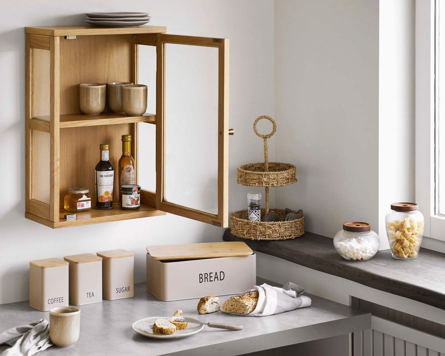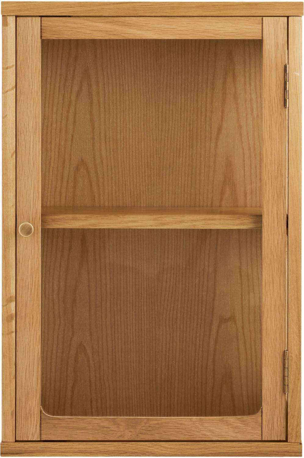 Die sorgfältige Konstruktion aus Eiche, Eichenfurnier und MDF sorgt für Stabilität und verleiht dem Vitrinenschrank eine warme, natürliche Ästhetik. Die charakteristische Maserung und die hellen Nuancen des Eichenholzes schaffen eine einladende Atmosphäre, die sich harmonisch in skandinavisch inspirierte Einrichtungsstile einfügt. Hinter der Tür aus gehärtetem Glas kannst du Sammlerstücke, Keramik, Gläser, Bücher oder andere dekorative Elemente ansprechend präsentieren – geschützt vor Staub und Beschädigungen, aber dennoch jederzeit sichtbar.