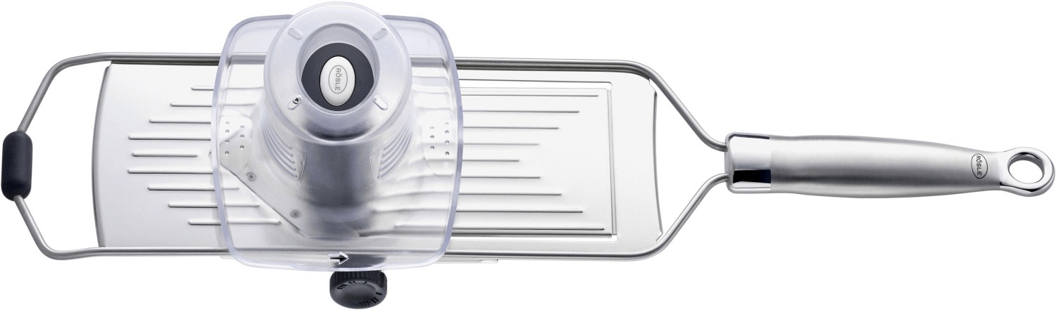 Mit diesem hochwertigen Mandolinenhobel von Rösle holst du dir professionelle Präzision direkt in deine Küche. Das innovative Design macht ihn zu einem unverzichtbaren Helfer bei der Zubereitung deiner Lieblingsgerichte. Gefertigt aus hochwertigem Stahl überzeugt dieser Hobel besonders durch seine extrem scharfe V-förmige Klinge, die selbst weichste Gemüsesorten wie Tomaten mit außergewöhnlicher Präzision und Gleichmäßigkeit schneidet.Der Mandolinenhobel des renommierten deutschen Herstellers Rösle bietet dir die Möglichkeit, die Schnittdicke in fünf verschiedenen Einstellungen bis zu 5 mm zu justieren. Dadurch behältst du die volle Kontrolle über deine kulinarischen Kreationen. Die durchdachte Konstruktion beinhaltet rutschfeste Silikonelemente, die für Stabilität während der Nutzung sorgen – unabhängig davon, in welchem Winkel du das Gerät hältst. Diese Sicherheitsdetails machen wirklich einen Unterschied in einer lebhaften Küche.