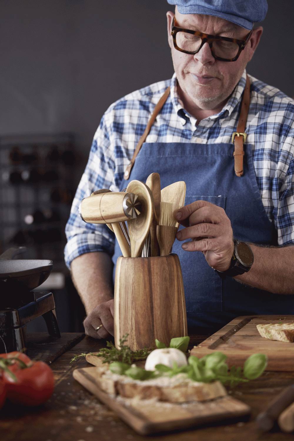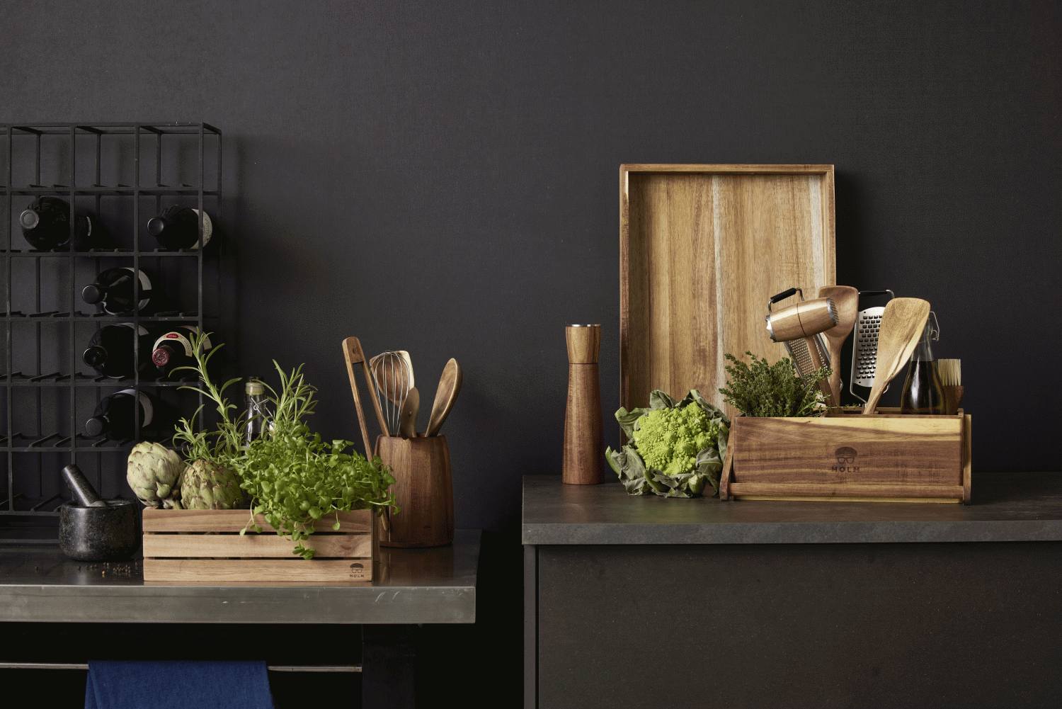 Der HOLM Utensilienhalter vereint Ästhetik und Anwendbarkeit auf beste Weise. Die robuste Konstruktion gewährleistet Stabilität auf der Arbeitsplatte, während die natürlichen Eigenschaften des Holzes den Halter widerstandsfähig gegen tägliche Beanspruchung machen. Die dichte Struktur des Akazienholzes macht das Produkt zudem langlebig und weniger anfällig für Flecken und Feuchtigkeit.