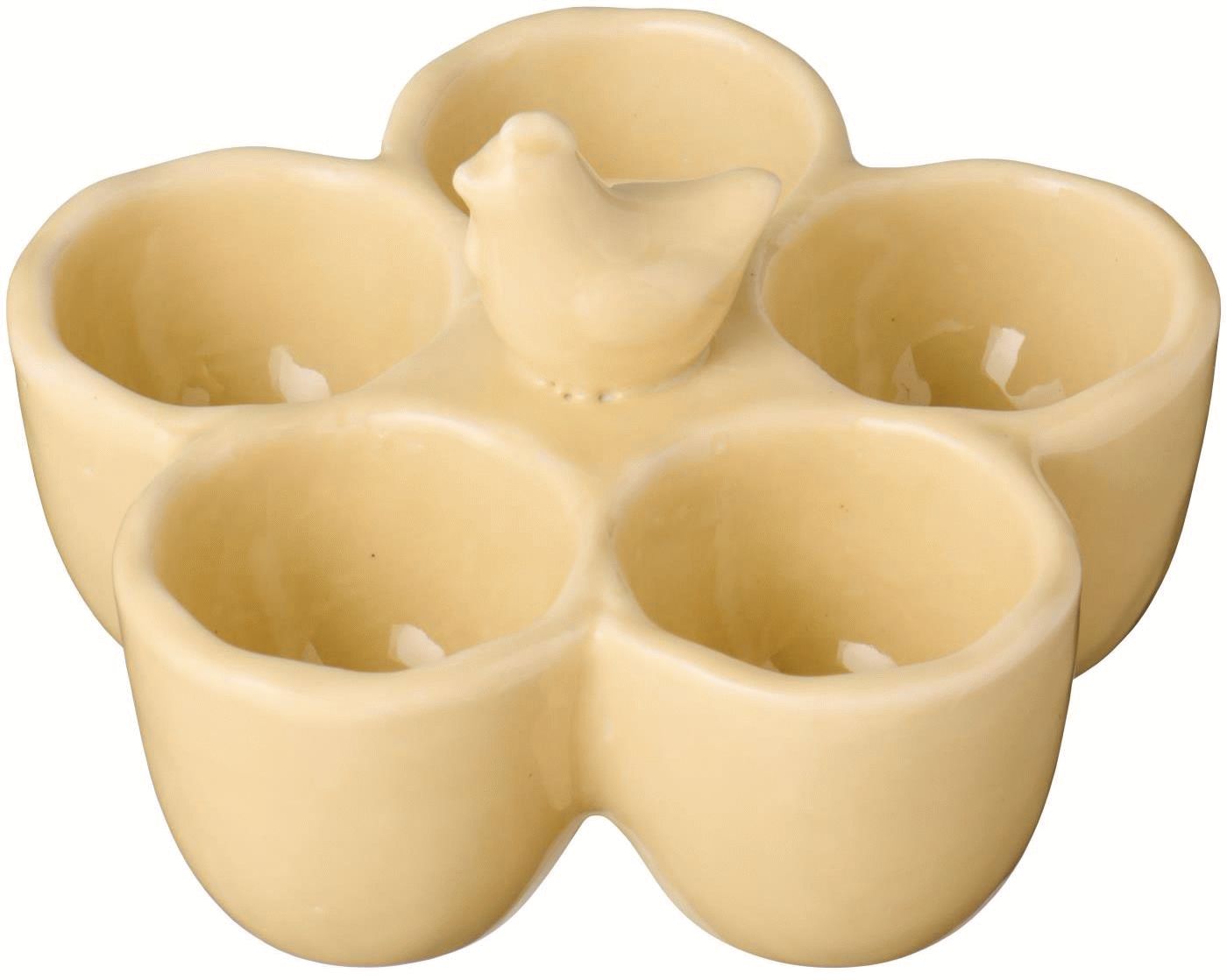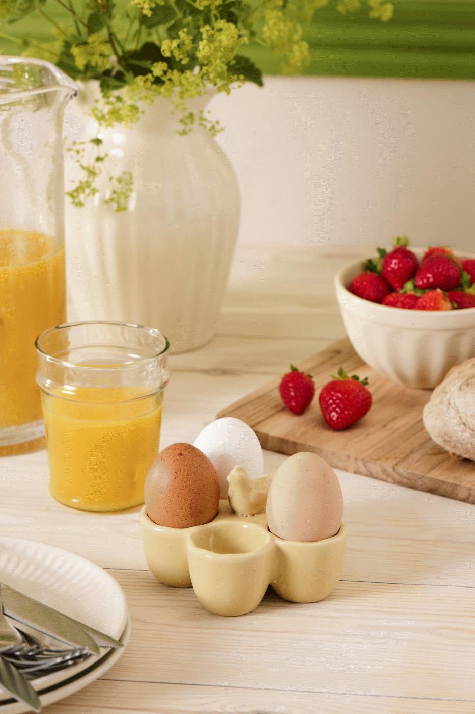 Diese bezaubernde Eierablage von Ib Laursen verwandelt dein Frühstück in ein besonderes Erlebnis und bringt dänische Designtradition direkt auf deinen Tisch. Die handgefertigte Steinzeugkonstruktion in leuchtend gelber Farbe kombiniert praktische Funktionalität mit charmantem skandinavischen Stil und schafft eine warme, einladende Atmosphäre in deiner Küche.Das blumenförmige Design mit seiner eleganten Silhouette macht diese Eierablage zu einem echten Hingucker. Die fünf sorgfältig geformten Vertiefungen bieten perfekten Halt für deine Eier, während die kleine dekorative Hühnerfigur als Krönung das liebevolle Detail vervollständigt. Du erhältst nicht nur ein praktisches Küchenutensil, sondern ein vielseitiges Dekorationselement, das sowohl als Aufbewahrungslösung im Kühlschrank als auch als stilvoller Blickfang bei Frühstück oder Brunch funktioniert.
