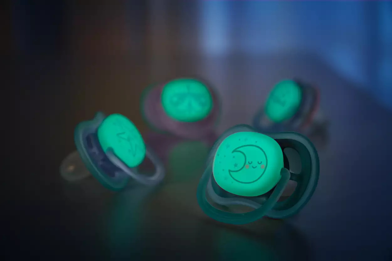 Besonders praktisch ist der selbstleuchtende Knopf, der es dir ermöglicht, den Schnuller auch im Dunkeln mühelos zu finden - perfekt für nächtliche Trostsituationen, ohne den Schlaf zu stören. Das bezaubernde Mond- und Sternen-Design verleiht den täglichen Routinen deines Babys einen charmanten Touch.