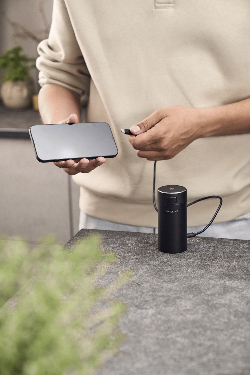 Das elegante schwarze Design mit klaren Linien fügt sich nahtlos in moderne Küchenumgebungen ein. Die kompakten Abmessungen von 5,3 x 5,2 x 9 cm ermöglichen eine platzsparende Aufbewahrung, wenn das Batteriepack gerade nicht im Einsatz ist.