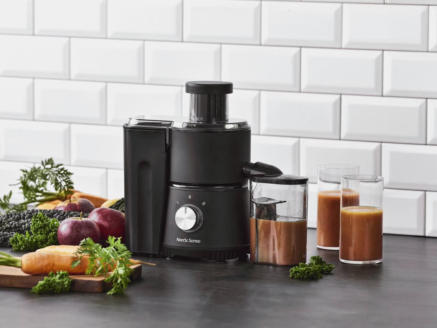 Mit diesem kraftvollen Entsafter von Nordic Sense holst du dir professionelle Saftqualität direkt in deine Küche. Der 400W starke Motor extrahiert mühelos Nährstoffe aus sowohl weichen als auch harten Zutaten und macht es kinderleicht, gesunde Säfte in deinen Alltag zu integrieren. Das elegante schwarze Design verkörpert skandinavische Ästhetik und fügt sich harmonisch in jede moderne Kücheneinrichtung ein.Die durchdachte Konstruktion überzeugt durch ihre benutzerfreundlichen Features: Mit dem großzügigen 5 cm Einfüllschacht sparst du wertvolle Vorbereitungszeit, da ganze Äpfel, Birnen und andere mittelgroße Früchte ohne Zerkleinern direkt verarbeitet werden können. Die intelligente Zwei-Geschwindigkeits-Funktion passt sich perfekt an verschiedene Zutaten an – niedrige Geschwindigkeit für weiche Früchte wie Trauben und Tomaten, hohe Geschwindigkeit für härtere Ingredienzien wie Karotten und Äpfel.