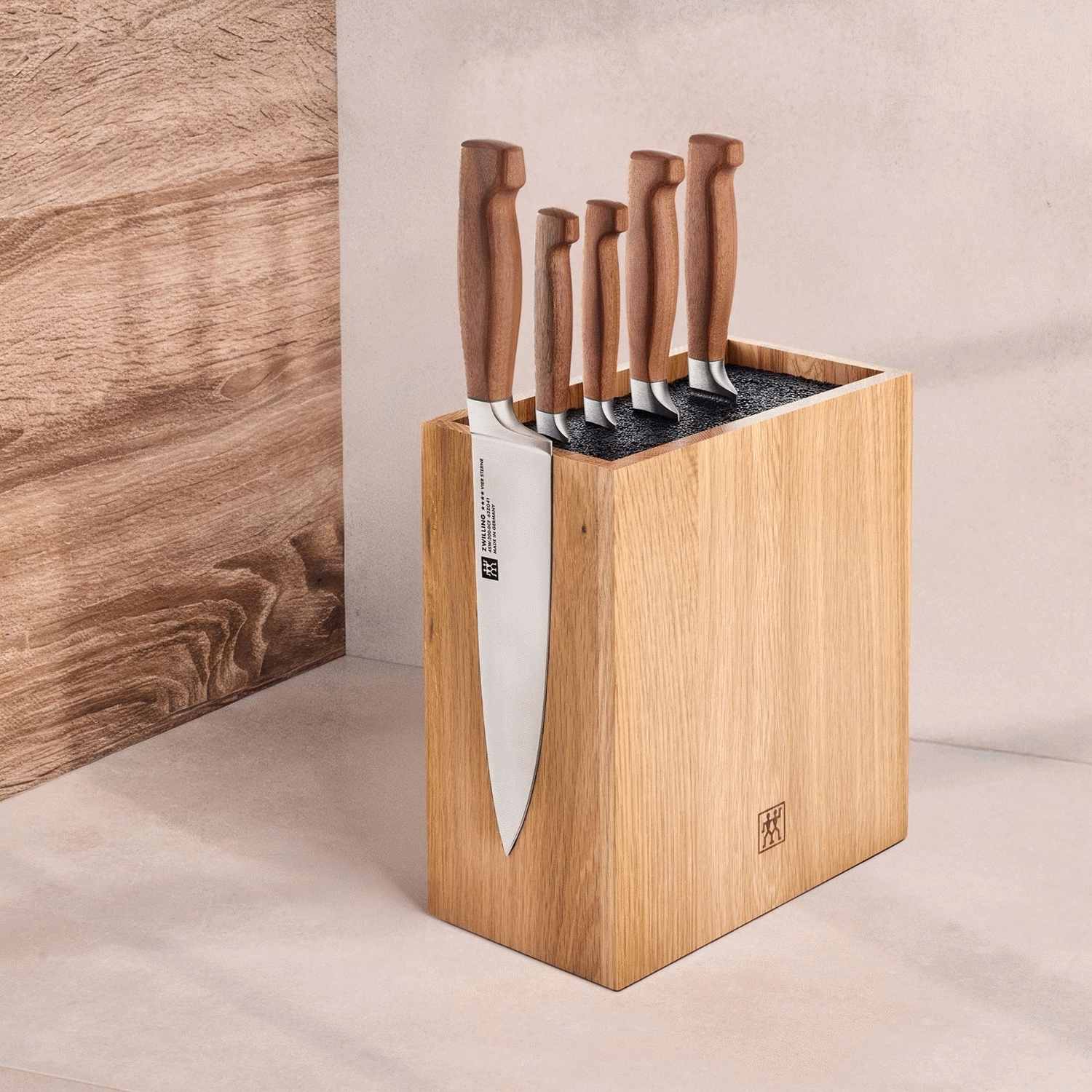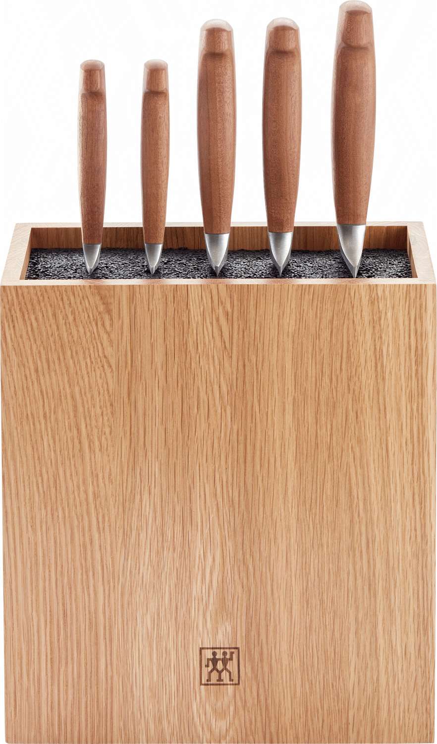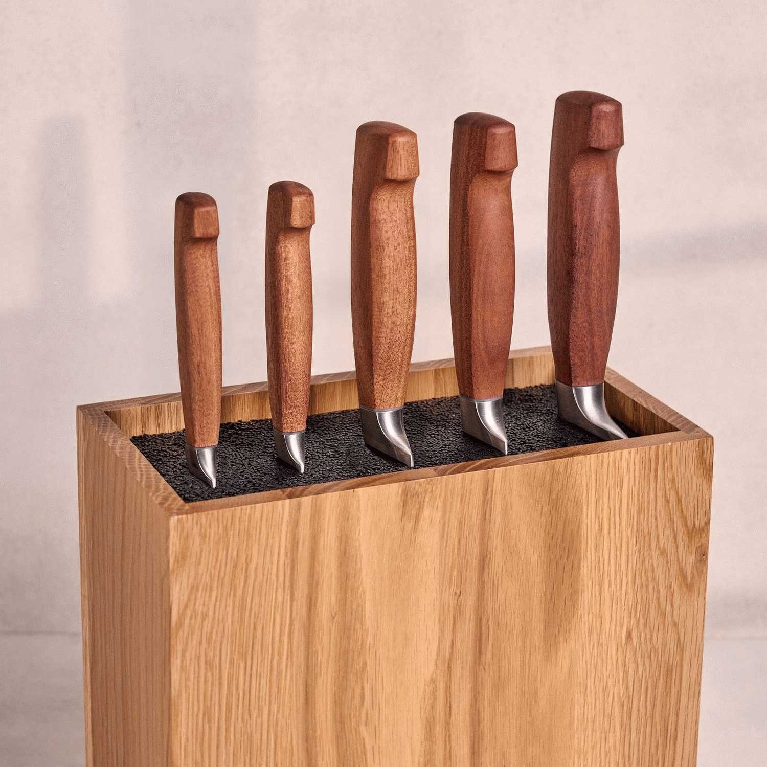- Komplettes Set mit fünf Messern und Messerblock aus massivem Eichenholz