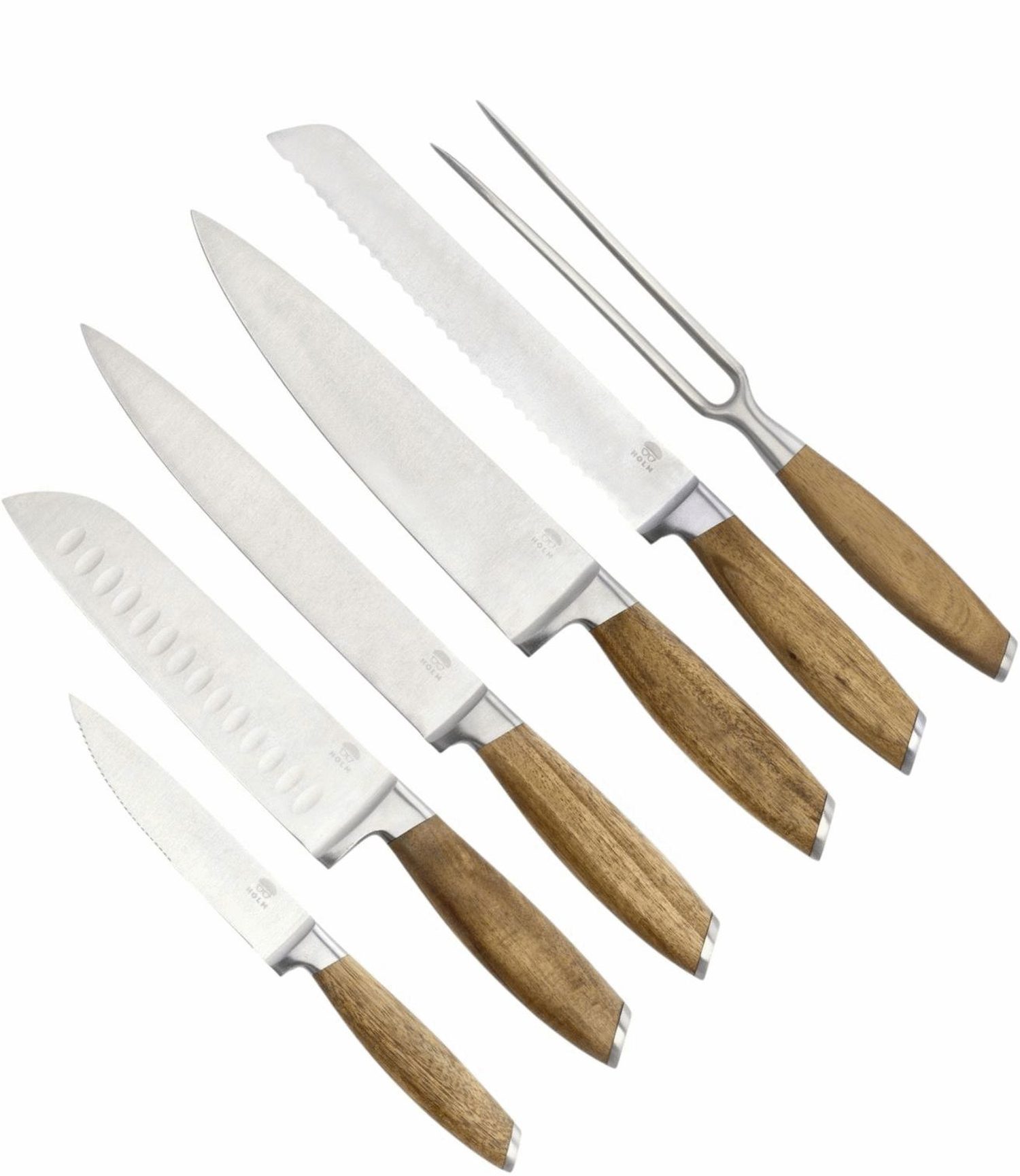 Besonders beeindruckend sind die Griffe aus FSC-zertifiziertem Akazienholz, die nicht nur für Nachhaltigkeit stehen, sondern auch natürliche Schönheit in deine Küche bringen. Jedes Messer wird durch die charakteristische Maserung des Akazienholzes zu einem Unikat, während die ergonomisch geformten Griffe optimalen Komfort und sichere Kontrolle gewährleisten. Die eleganten Stahlkappen am Ende jedes Griffs verleihen dem Set ein raffiniertes Finish und erhöhen gleichzeitig die Langlebigkeit.