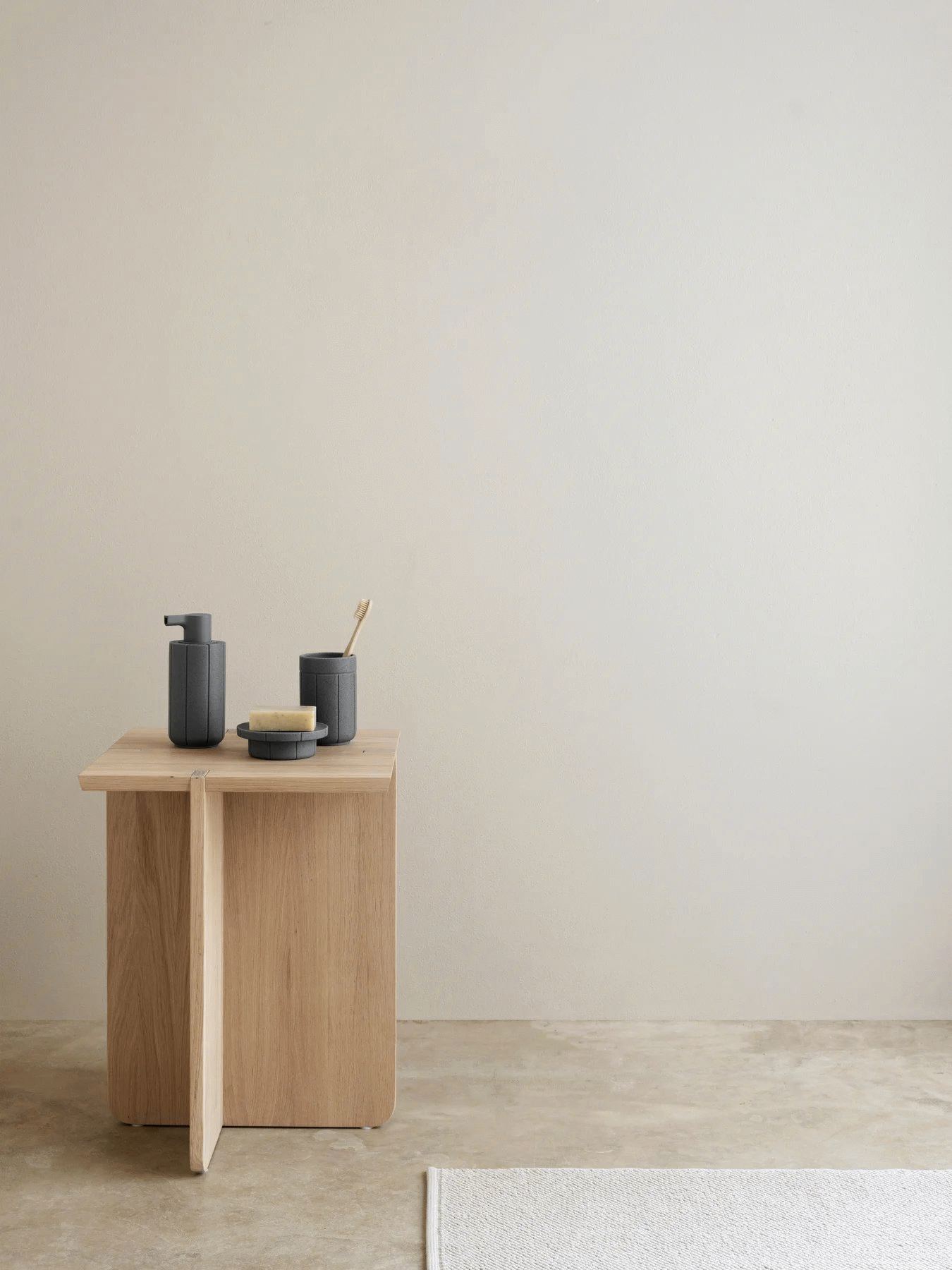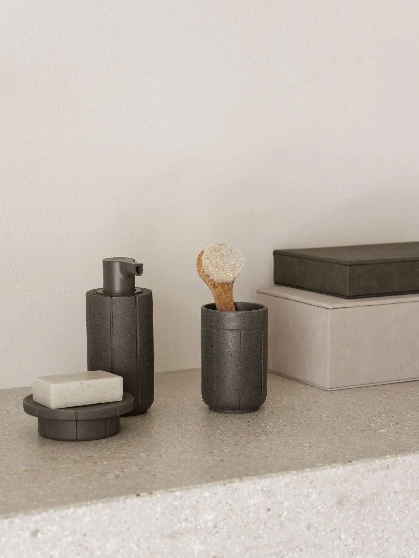 Das Besondere an diesem Zahnbürstenbecher liegt in seinem nachhaltigen Material: Er besteht aus recyceltem Polyresin, was ihn zu einer umweltfreundlichen Wahl für bewusste Verbraucher macht. Polyresin, eine Kombination aus gemahlenem Stein und Kunststoff, zeichnet sich durch außergewöhnliche Haltbarkeit und Robustheit aus. Dadurch hält der Becher problemlos dem täglichen Gebrauch und der Feuchtigkeit im Badezimmer stand, ohne seine Form oder sein Finish zu verlieren.