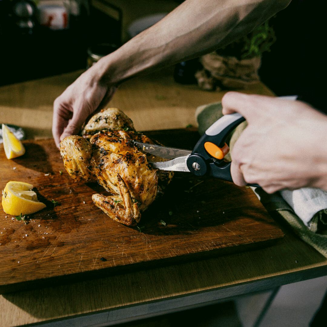 Mit dieser professionellen Geflügelschere von Fiskars wird die Küchenarbeit deutlich effizienter und präziser. Die 25 cm lange Schere aus der bewährten Functional Form Serie ist speziell für die problemlose Bearbeitung von Geflügel und Wild entwickelt worden und stellt sowohl für Hobbyköche als auch für leidenschaftliche Küchenmeister ein unverzichtbares Werkzeug dar.Die gebogenen, profilierten Klingen sind sorgfältig konstruiert, um dir optimale Schneidleistung beim Häuten, Schneiden oder Zerteilen von Fleisch zu bieten. Besonders praktisch ist die spezielle Aussparung im Klingenbereich, die es ermöglicht, mühelos durch Knochen zu schneiden, ohne deine Hand unnötig zu belasten. Mit einem Gewicht von nur 200 Gramm liegt die Schere angenehm in der Hand, selbst bei längerer Verwendung.