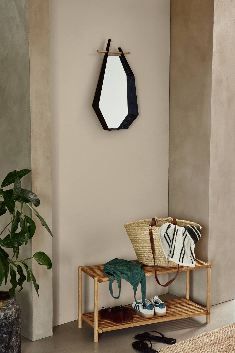 Für noch mehr Funktionalität kannst du das Regal mit kleinen Körben oder Boxen ergänzen, die dabei helfen, Alltagsgegenstände zu organisieren und zusätzliche Ordnung zu schaffen. Die natürliche Holzmaserung verleiht jedem Raum einen eleganten Touch und macht das Schuhregal zu einem dekorativen Element.