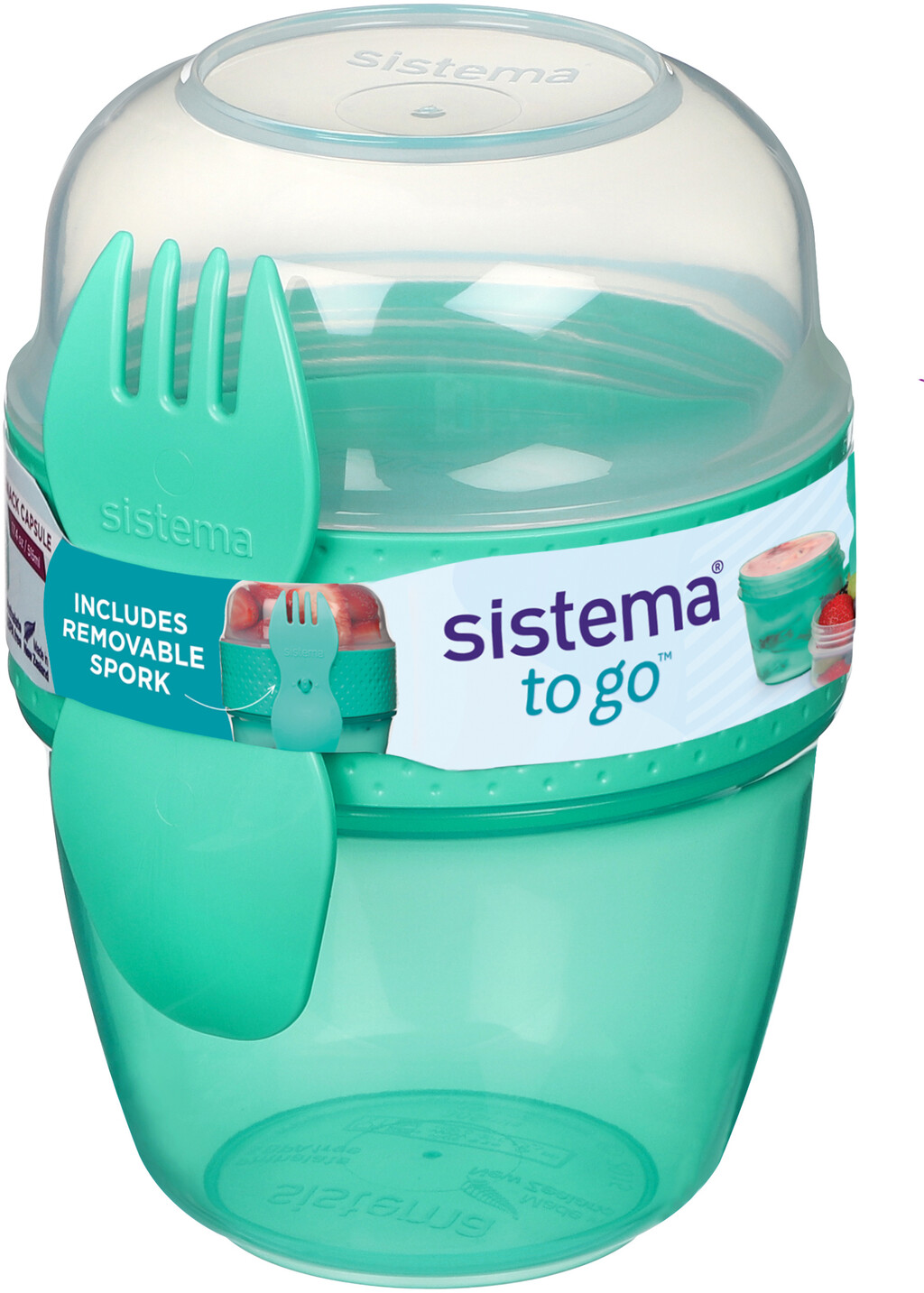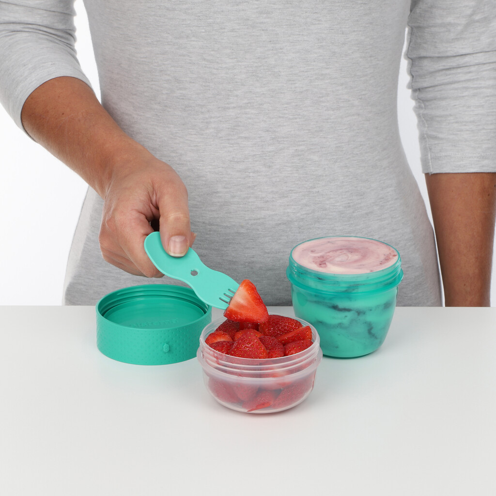 Mit Sistemas Snack Capsule To Go haben Sie alles in einem. 2 Fächer mit passender Gabel.
