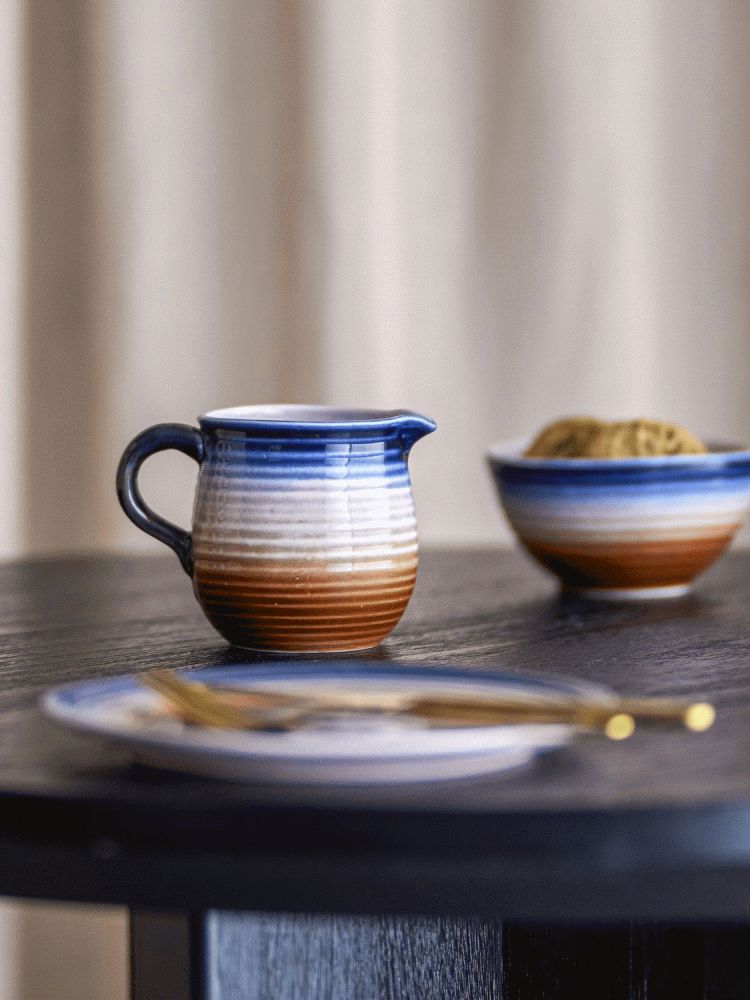 Das hochwertige Steinzeug, aus dem diese Milchkanne gefertigt ist, überzeugt durch seine Langlebigkeit und sein zeitloses Erscheinungsbild. Der geschwungene Henkel liegt angenehm in der Hand und ermöglicht dir ein präzises, sicheres Eingießen. Die glasierte Oberfläche zeigt eine wunderschöne Mischung aus gedämpften Farbtönen, die harmonische Kontraste schaffen und der Kanne einen unverwechselbaren, handgefertigten Charakter verleihen.